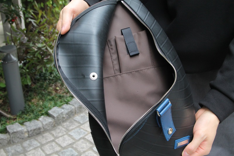 更にバッグ内部のカラーはブラウンにする事で、タイヤチューブで個性を出しつつも落ち着いた印象に仕上がりました。