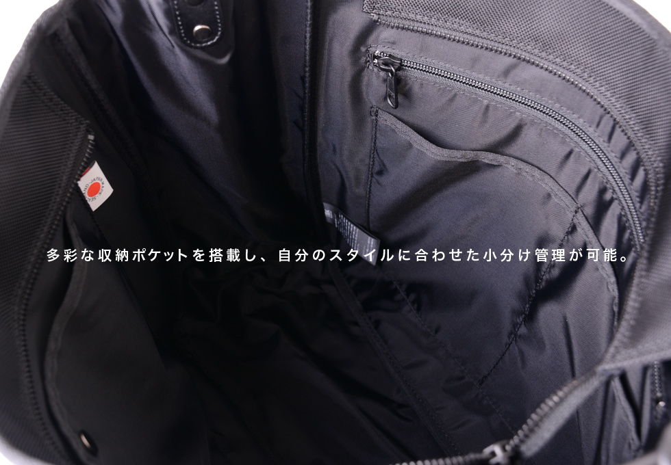 可変出来る容量を支えるようにバッグ内外共にポケット数が多いバッグでもありますので、お荷物が整理しやすいです。