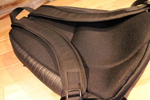 背面はメッシュ素材。さらにショルダーベルトは体に添ってフィットしやすいように曲がっています。