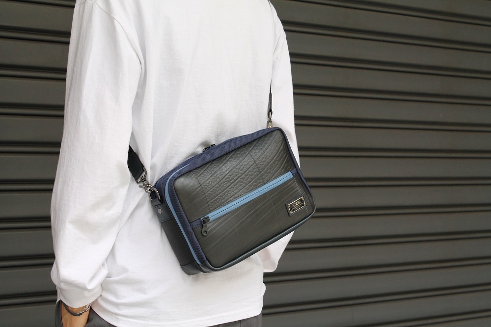 丸みがあり、コンパクトな大きさなのでカジュアルで使い易いデザインですが、タイヤチューブの比率が多いバッグなので、チューブの質感・色味更にアクセントにレザーを使う事で品のあるバッグに仕上がっています。
