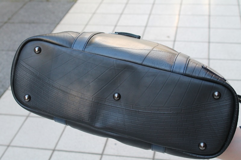 バッグ底面はタイヤチューブで底鋲が付いていますので、安心してバッグを床に置けると同時に、バッグ自体が自立してくれるのも嬉しいポイントです。更に限定商品では、取り外し可能な底板も付属!