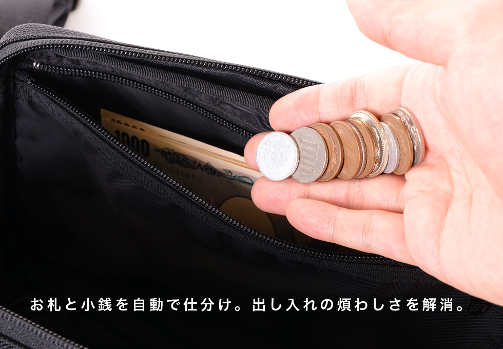 バッグ前面の内部ポケットにはお札と小銭を自動仕分けの機能付き!