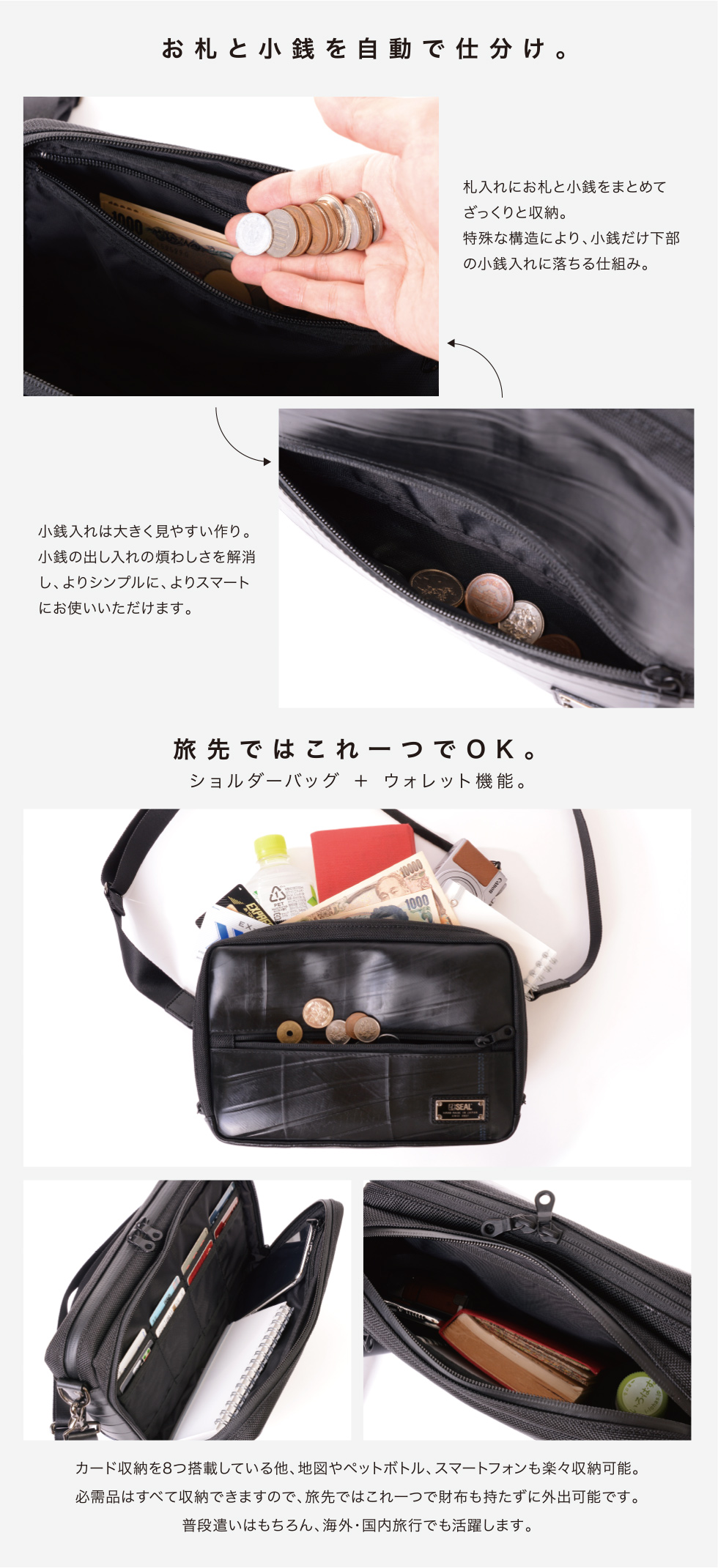 何と言ってもお札と小銭を自動で仕分ける機能が特徴的なショルダーバッグ。