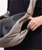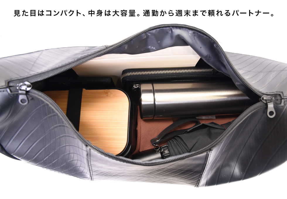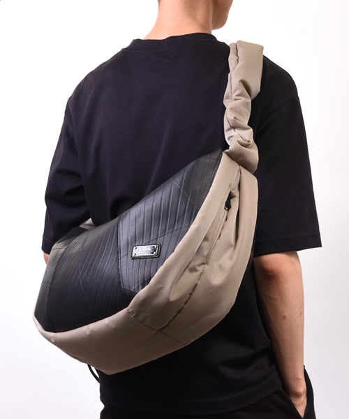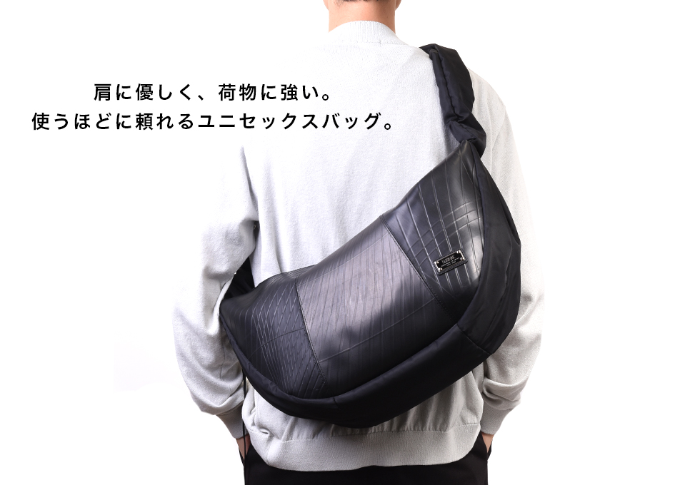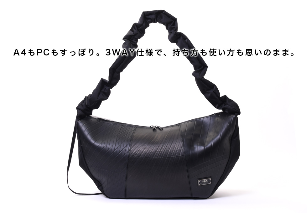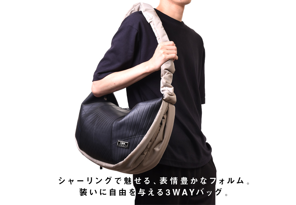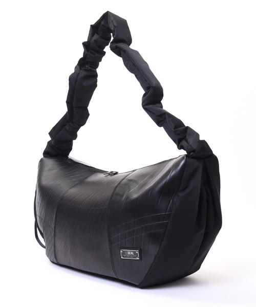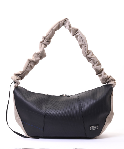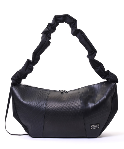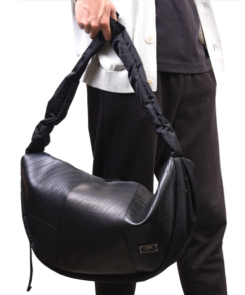 トレンド感あふれるハーフムーン型に、シャーリング仕様のショルダーストラップを組み合わせた3WAYショルダーバッグ。ショルダー部分はドローストリングで長さを調整でき、手持ち・肩掛け・斜め掛けとスタイルに合わせた使い分けが可能。シワの出方やドレープ感が美しく、ファッション性と機能性を両立しています。 本体素材には、水や汚れに強くタフなタイヤチューブを使用。ナイロン部分は回収された漁網や衣類を原料に再生されたリサイクルナイロン糸を用いた環境配慮型生地で、美しい光沢と柔らかな質感を兼ね備えています。内装にはSEALオリジナルのジャガード生地を採用し、細部までこだわりを感じさせる仕上がりです。 収納力も魅力のひとつ。立体裁断によるラウンドフォルムは見た目以上の容量を誇り、A4サイズや14インチのノートPC、折りたたみ傘、タンブラーなども余裕で収納可能。内側にはジップ付きの大きなポケットを配置。さらに外側サイドにはスマホや鍵を入れられる隠しポケットも備えています。 男女問わず使えるユニセックスなデザインで、通勤・通学から休日の外出まで幅広いシーンで活躍。シャーリングデザインと機能美が融合した、スタイルのアクセントにもなる新しい定番バッグです。