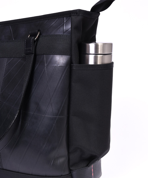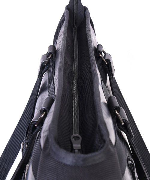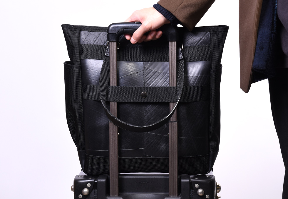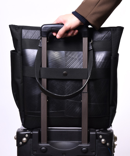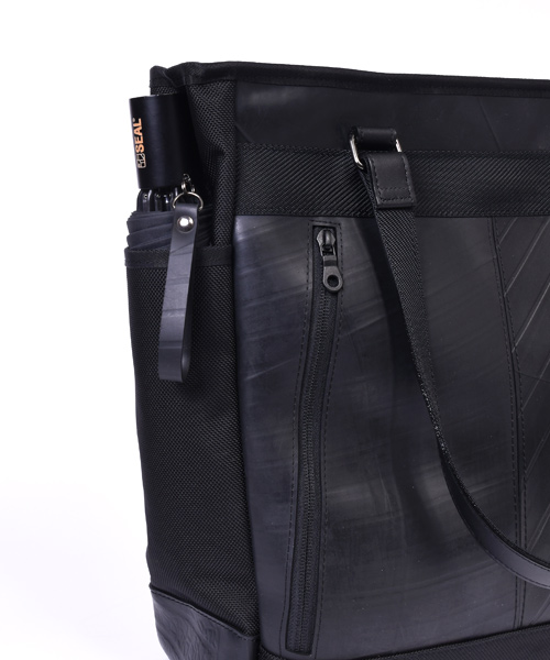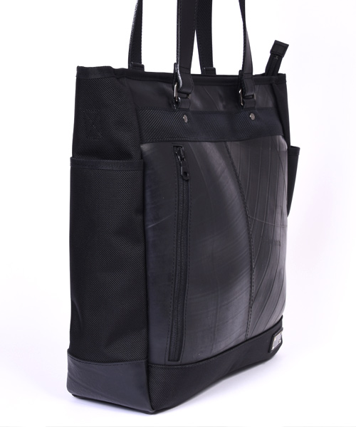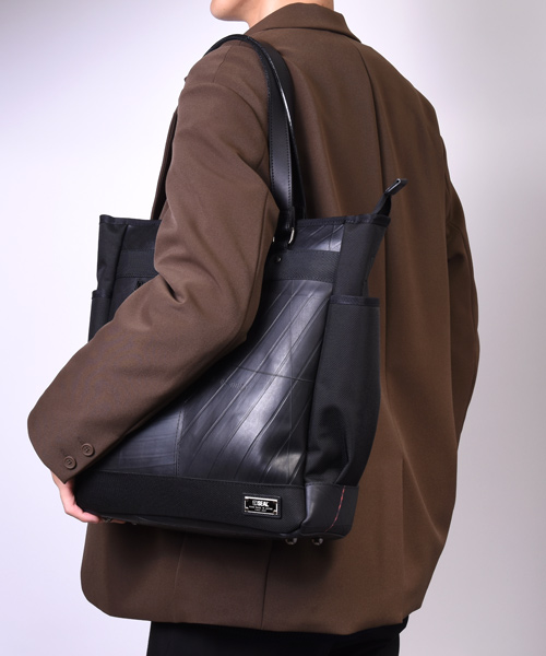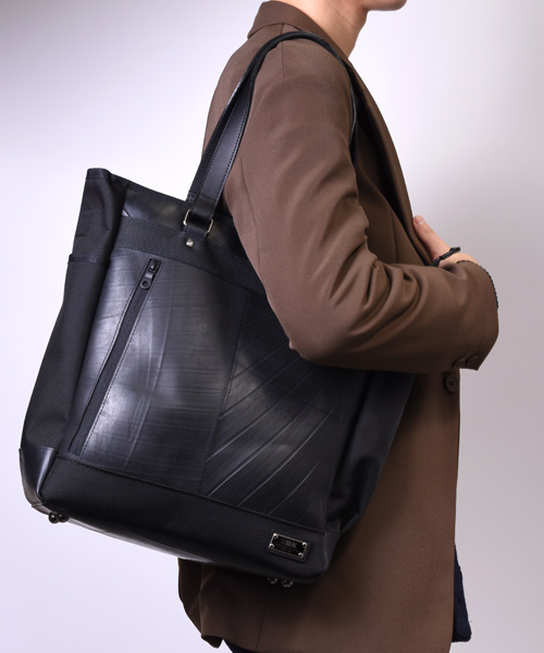 耐久性と耐水性に優れた2種類の異なる素材を組み合わせた、高機能でスタイリッシュな縦長タイプのトートバッグ。