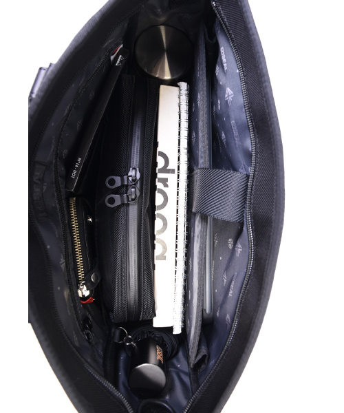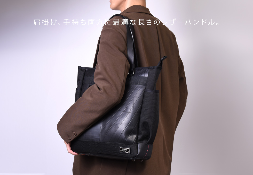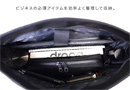 安全性を考慮したファスナー開閉のメインコンパートメントで、中身が落ちたり中身が見られてしまう心配がありません。 大切なPCやタブレットを安全に持ち運べるよう専用の保護パッド入りポケット(13インチ相当)、オープンポケットやファスナーポケット、ボトルホルダー、折り畳み傘収納などを装備。ビジネスの必須アイテムを効率よく整理して収納できます。ユーザビリティの充実した仕上がりとなっております。 またスマホや定期など、よく使うアイテムの収納には、フロントのファスナーポケットがおススメ。 肩掛け、手持ち両方に最適な長さのレザーハンドルも装備しています。 またショルダー用のDカンも装備しており、ショルダーベルト(別売)を取り付ければ ショルダータイプのバッグとしてもご使用いただけます。 縦長なので、見た目はスッキリとしていながら、大容量。 肩にかけた状態でもかさばらないので、お出掛けや通勤の際に電車やバスの中でも邪魔になりません。 ビジネスシーンから普段使いまで幅広いシーンでの活躍が期待されるアイテムです。