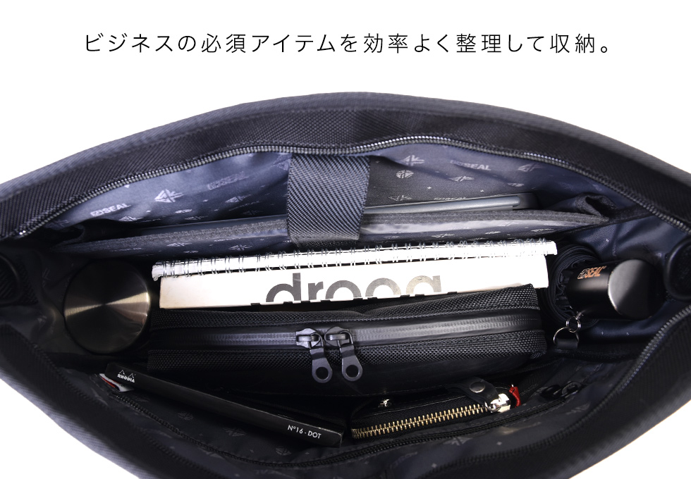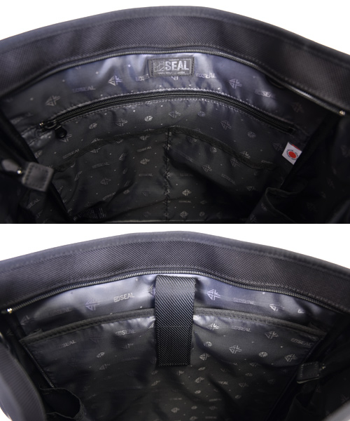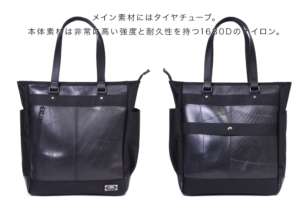 メイン素材にはタイヤチューブ。本体素材は非常に高い強度と耐久性を持つ1680Dのナイロンを採用。防水性と耐久性を兼ね備え、黒一色のワントーンでありながら、異なる質感の生地を組み合わせることでコントラストの効いたスタイリッシュなデザインに仕上げています。 内装には視認性の高いSEALオリジナルのジャガード生地を採用。