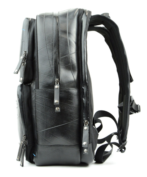 多彩な収納ポケットを搭載し、ノートPC(約W390×H270×D30mmまで)、iPadも同時収納可能なモバイラーズバックパック。さらに、重いモバイル機器を運ぶ事を想定し、負荷の強い部分を補強し、耐久性の強い素材を使用する事により、より強度を上げた商品です。 PC収納部分とメイン収納が完全に別れているセパレートタイプ。角度調整可能なパッド入りのショルダーストラップ、チェストストラップなど、フィット感や快適性にも優れています。底部分には、本革を使用しており高級感も感じさせる商品です。前面ポケットには脱着式のホルダーも搭載されており、防犯性にも優れています。 また、止水ファスナーを使用する事により防水性能を飛躍的に高めており、雨に弱いモバイル機器に最適の商品となっております。強靭なタイヤチューブの素材が衝撃や雨から大切なPCなどを守ります。 このモバイラーズバックパックは、一個辺り約2520gのCO2が削減されます。