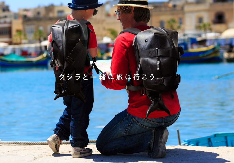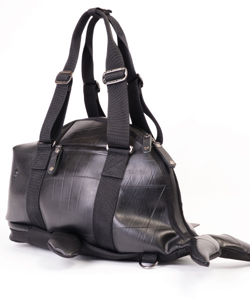 国内職人の緻密な技により複雑な形状を再現した、まるでアート作品のような遊び心溢れる逸品です。タイヤチューブの持つ質感や曲線を活かし、クジラの質感やフォルムを表現。立体的なフォルムは驚くほどの収納力を実現しています。全面に止水ファスナーを採用する事により突然の雨にもしっかりと内部を守り、さらに長さ調整可能なハンドルや収納可能なリュックショルダーや目の部分にイヤホンジャックを採用するなど、実用性をも兼ね備えています。