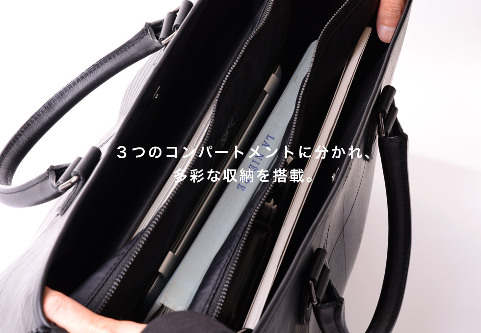 約10cmの拡張機能を搭載したスリムタイプのビジネスバッグバッグのエクスパンダブルモデル。 メインコンパートメントに約10cmの拡張機能を備えており、荷物が増えても問題なく対処できます。 手持ち、ショルダーと使い分けられる便利な2WAYタイプ。 そこ面には底鋲と底板を搭載し、拡張時には自立するビジネスバッグとして活躍します。 多彩な収納ポケットを搭載し、自分のスタイルに合わせて小分けが可能。 収納は3つのコンパートメントにわかれており、機能的な使い分けをしていただけます。 ハンドルには国産の上質な本革を採用。硬すぎず柔らかすぎず手になじむ肌触りです。 このスリムビジネスバッグ エクスパンダブルは、一個辺り約2,520gのCO2が削減されます。