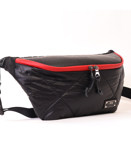 「藤倉パラシュート」をキルティング加工した約200gの超軽量ウエストボディバッグ。 自衛隊でも採用される、非常に軽量で丈夫なパラシュート素材を使用した、重さ約200gという持っているのを 忘れるほどの軽いウエストボディバッグ。500mlのペットボトルや、長財布も楽々収納可能な容量。 また、ショルダーには国産の上質なSEALオリジナルジャガードテープを採用。 サイズ調整や着脱のしやすいスプリットストラップ仕様、ウエストタイプでもしっかり装着できます。 この藤倉航装コラボ/ウエストボディバッグ AIR MODEL Lサイズは、一個辺り約380gのCO2が削減されます。