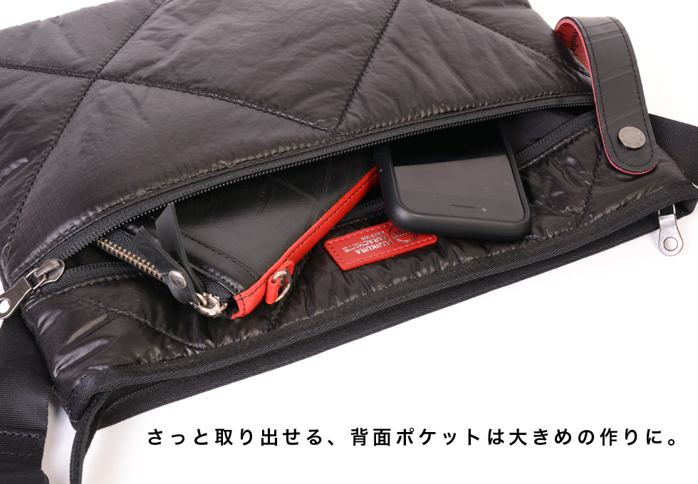 持っているの忘れるほどの軽いサコッシュバッグのLサイズ。 「藤倉パラシュート」をキルティング加工した約200gの超軽量サコッシュバッグに大きめのLサイズが登場! B5サイズのノートや長財布も楽々収納可能。大きめサイズでスペックアップを施しながら、重さは変わらず200gのまま。 持っているの忘れるほどの軽いサコッシュバッグを実現しました。この藤倉航装コラボ/サコッシュバッグ AIR MODEL Lは、一個辺り約210gのCO2が削減されます。