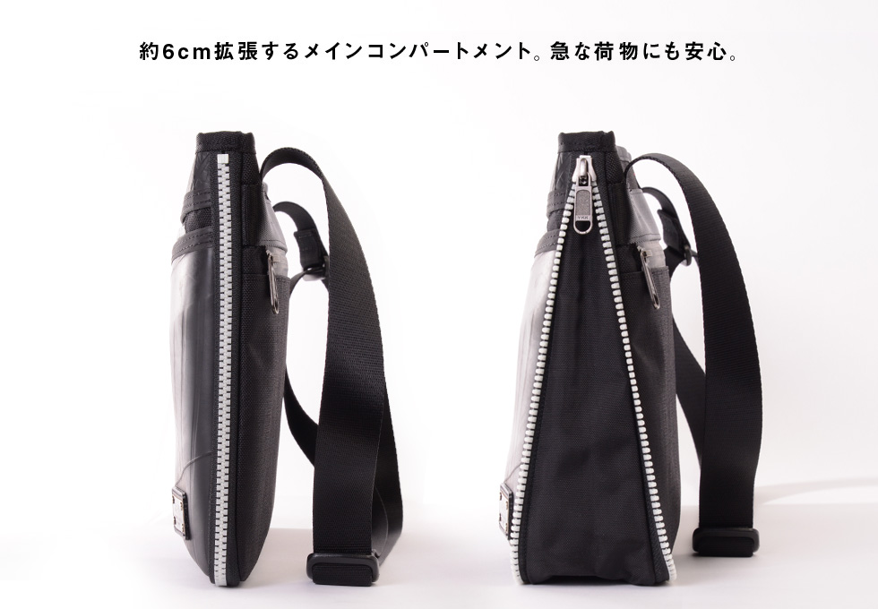 サコッシュバッグにエクスパンダブルモデルに、夜間の移動をより安全にするナイトライドモデルが登場。メインコンパートメントに約6cmの拡張機能を備えており、荷物が増えても問題なく対処できます。表面には防水性と耐衝撃性を兼ね備えたタイヤチューブ素材を、裏面にはシンコー株式会社が開発した新素材「BEATTEX(ビートテックス)」を使用しております。薄マチながらA4サイズも収納可能で、体にぴったりとフィットしアクティブな環境でも非常に使いやすいのが特徴です。使いやすいシンプルなデザインにより、重さはたったの450グラム。表面素材のタイヤチューブにより、一点ごとに表情が異なるまさに世界に一つだけの商品となっております。このサコッシュバッグ エクスパンダブルは、一個辺り約420gのCO2が削減されます。