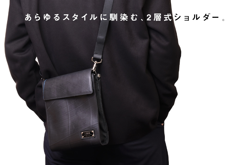 日常に溶け込むデザインの2層式がま口ショルダーバッグ。 メイン収納とサブ収納で2層に分かれた特別な構造のスクエアタイプのショルダーバッグ。 タイヤチューブ製でフラップタイプのメイン収納は防水性も高く、出し入れがしやすい仕様になっております。 がま口フレーム仕様のサブ収納は間口をがっちりホールドするので、防犯性の高い仕様になっております。 スマホや、長財布なども収納できるゆったりとしたサイズ感。 容量によってサイズが変わる蛇腹仕様でコンパクトなのに大容量を実現しました。 直線がま口金具が印象的なユニセックスデザインのショルダーバッグです。 このキスロックスクエアショルダーバッグは、一個辺り約1155gのCO2が削減されます。
