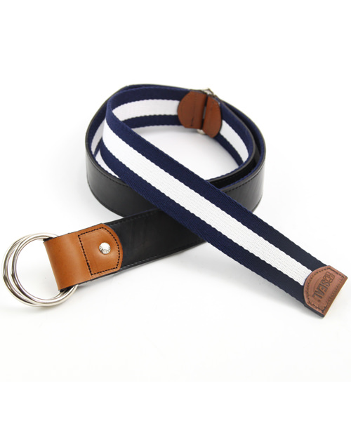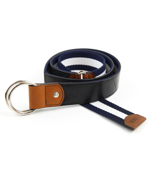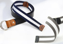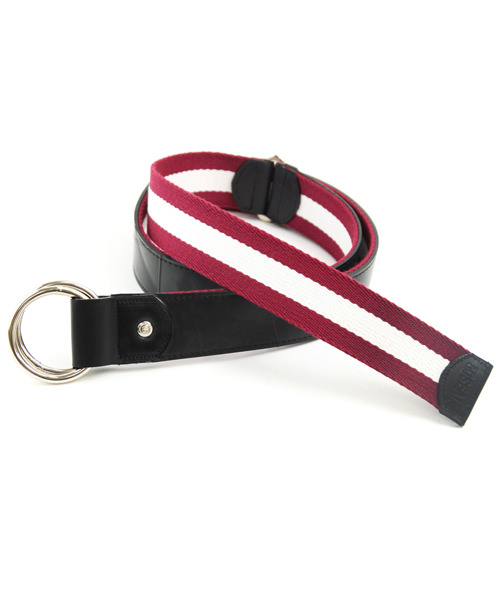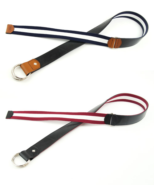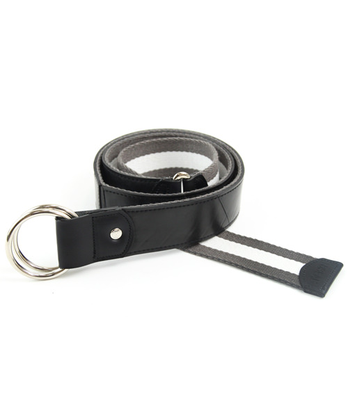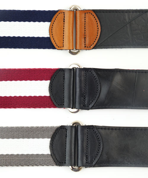 国産の上質なラインテープを使用した、リングベルト。タイヤチューブと本革、ラインテープが絶妙なバランスで組み合わされたリングベルトは、カジュアルなパンツスタイルに映えます。また、リバーシブルでも使用できるので、スタイルに合わせて使用して頂けます。※リバーシブルで使用される場合は、タイヤの色移りにご注意ください。 このライン リングベルトは、一個辺り約185gのCO2が削減されます。